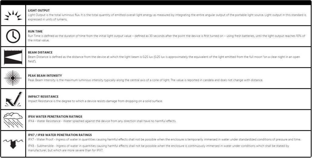 Het American National Standards Institute (ANSI) heeft prestatienormen en symbolen ontwikkeld om de eigenschappen en pluspunten van een hoofdlamp effectief te communiceren. Het zijn de eerste dingen waar je op moet letten bij het uitkiezen van je hoofdlamp.